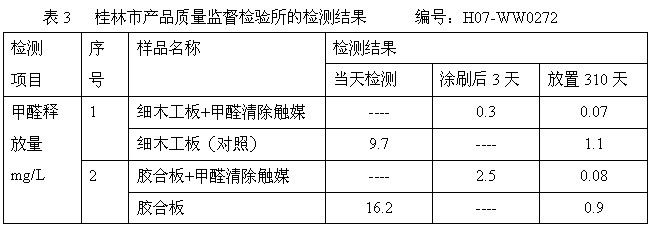表3是桂林市產(chǎn)品質(zhì)量監(jiān)督檢驗(yàn)所的檢測(cè)結(jié)果。將1220*2440*18mm的細(xì)木工板鋸成2塊,一塊每平方米涂刷50克甲醛清除觸媒,另一塊空白對(duì)照;將1220*2440*5mm的膠合板鋸成2塊,一塊每平方米涂刷35克甲醛清除觸媒,另一塊空白對(duì)照。涂刷甲醛清除觸媒的細(xì)木工板甲醛釋放量由空白對(duì)照的9.7mg/L(E3級(jí)人造板)降低為0.3 mg/L,310天后為0.07 mg/L;涂刷甲醛清除觸媒的膠合板甲醛釋放量由空白對(duì)照的16.2mg/L(E3級(jí)人造板)降低為2.5 mg/L,310天后為0.08 mg/L。