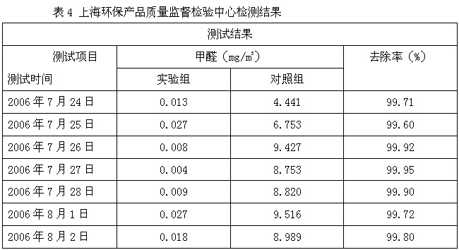 表4是上海環(huán)保產(chǎn)品質(zhì)量監(jiān)督檢驗(yàn)中心對(duì)甲醛清除觸媒連續(xù)10天的檢測(cè)結(jié)果??梢栽斐煽諝庵屑兹舛瘸^**啊標(biāo)準(zhǔn)規(guī)定近80倍的膠合板,涂刷甲醛清除觸媒后,空氣中甲醛的濃度小于0.027mg/m3,低于周圍環(huán)境空氣中的甲醛濃度0.04mg/m3,遠(yuǎn)低于**標(biāo)準(zhǔn)規(guī)定的0.10mg/m3。69天和380天后。經(jīng)過處理的膠合板,環(huán)境艙中的甲醛濃度依然小于0.03mg/m3,未處理膠合板環(huán)境艙中的甲醛濃度為5.37mg/m3、4.87mg/m3。
