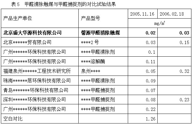 表5是海南藍(lán)清環(huán)保科技有限公司將甲醛清除觸媒與國(guó)內(nèi)外其他產(chǎn)品的對(duì)比試驗(yàn)結(jié)果。試驗(yàn)方法:在一張10mm后的膠合板上,裁取10塊300×300mm的試件,9塊分別涂刷表中產(chǎn)品3.6~4.0g,在室內(nèi)自然放置2天,之后分別放入40L干燥器、密封。48小時(shí)后取樣檢測(cè)氣候箱中的甲醛濃度。