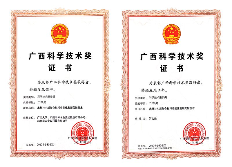 2021年7月31日廣西壯族自治區(qū)召開(kāi)2020年度科學(xué)技術(shù)獎(jiǎng)勵(lì)大會(huì),由北京盛大華源科技有限公司參與完成的“木材與木質(zhì)復(fù)合材料功能化利用關(guān)鍵技術(shù)”榮獲廣西科學(xué)技術(shù)進(jìn)步獎(jiǎng)二等獎(jiǎng)。