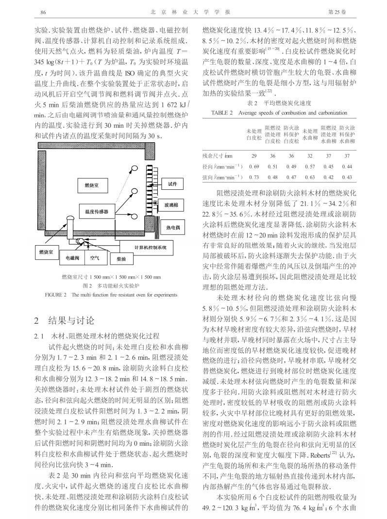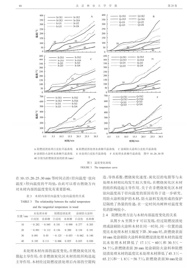 摘要:為了弄清楚阻燃處理木材的燃燒及其熱傳導(dǎo)規(guī)律 ,該研究采用多功能耐火實驗爐模擬典型火災(zāi)的發(fā)生過程 ,測定了未處理、阻燃劑水溶液浸漬處理、涂刷防火涂料白皮松和水曲柳木材的燃燒及木材內(nèi)不同位置的升溫過程 .結(jié)果表明 :①火災(zāi)發(fā)生過程中未處理木材、阻燃浸漬處理和涂刷防火涂料木材內(nèi)部溫度上升過程出現(xiàn) 5個階段 ;②經(jīng)過阻燃浸漬處理和涂刷防火涂料后 ,木材的燃燒炭化速度降低了 2 1 1%~ 35 6 % ,內(nèi)部溫度上升速度大幅度下降 ;③白皮松木材的燃燒炭化速度比水曲柳木材的燃燒炭化速度快 8 5 %~ 17 4 % ;④未處理木材沿弦向的燃燒炭化速度比徑向快 5 8%~ 10 5 % ;⑤木材內(nèi)部的溫度變化沿燃燒推進(jìn)方向不同而不同 .