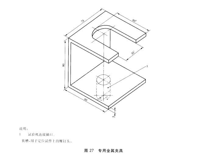 6、擰入螺釘后,應立即進行拔釘試驗,金屬專用夾具和試件接觸的表面與試驗機拉伸中心線垂直,螺釘與實驗機拉伸中心線對中,拔釘時應均勻加載荷,從加荷開始在(60±30)s捏達到*大載荷,記下*大載荷,精確至10N。