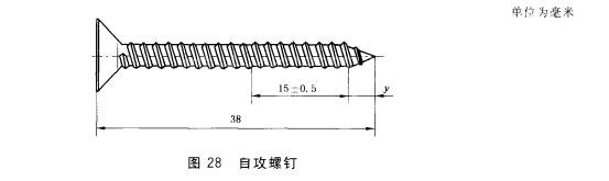 3、測試板面握釘力時,在試件表面中心點,先用Φ(2.7±0.1)mm的鉆頭鉆導孔,導孔深度為19mm,螺釘采用GB845-ST4.2×38C-H或者GB846-ST4.2×38C-H自攻螺釘,釘長38mm,外徑Φ4.2mm。擰入螺釘,擰入深度為(45+0.5)mm,擰進的螺紋為全螺紋。